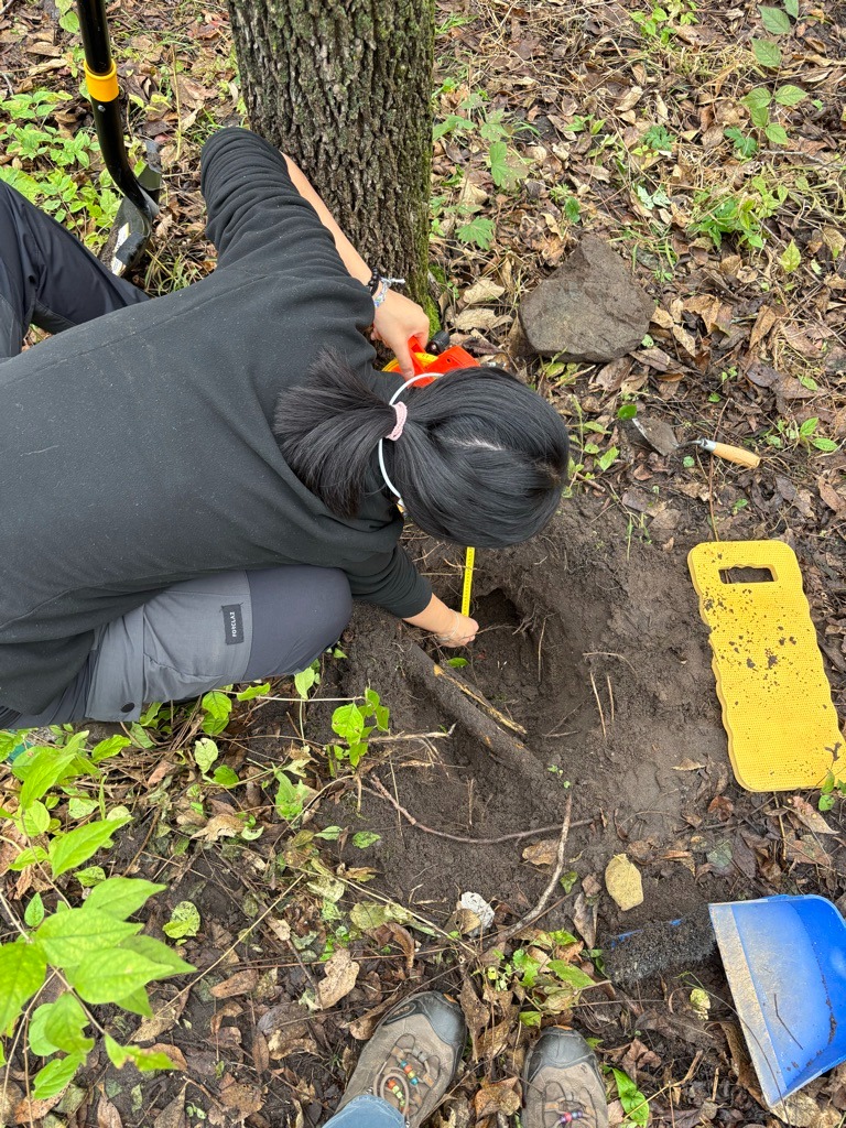 Thursday’s group began their lab by first dividing themselves into smaller teams of 2–3 people. Each of these teams was then assigned a test pit and used large shovels, trowels, and even clippers to dig. Stones, plant matter, and tree roots often impeded the digging process, requiring teams to either work around the obstacle or—ideally—remove it. Dirt from each test pit was put into large plastic buckets to later be sifted through.