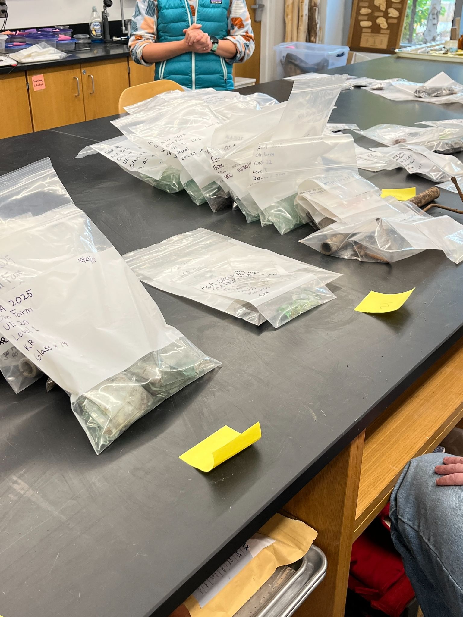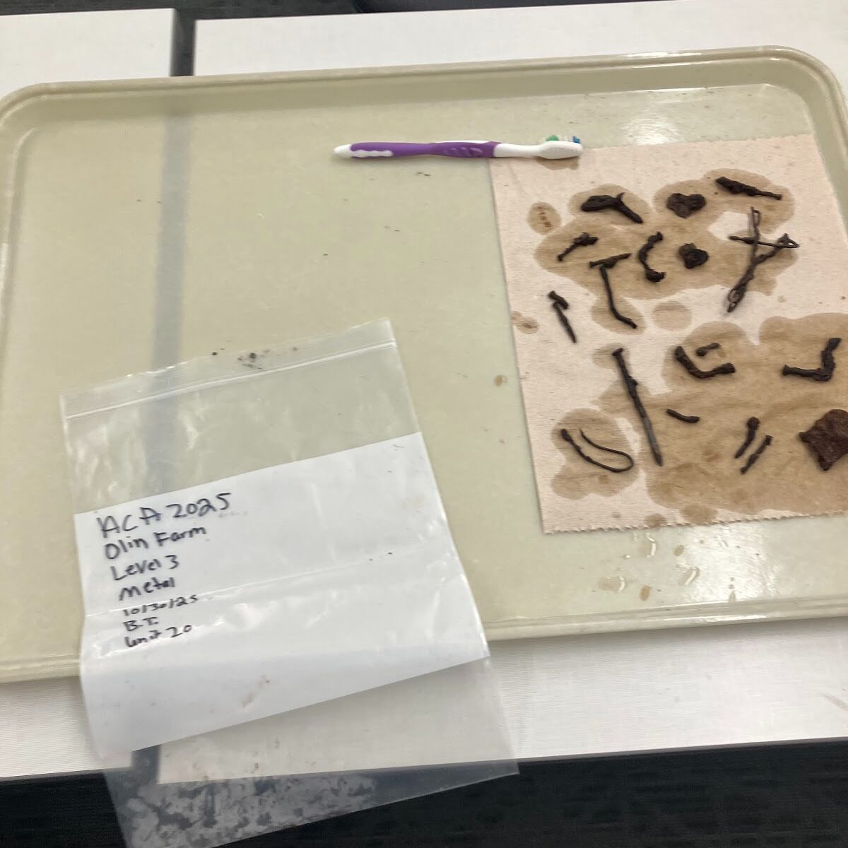 The primary focus for this course in fall 2025 was the Olin Farm site. This event allows us to inform the community about archaeology, including our research and excavation methods, the tools and equipment used in archaeology, along with counting, bagging, cataloguing, and labelling artifacts that were found at the site.