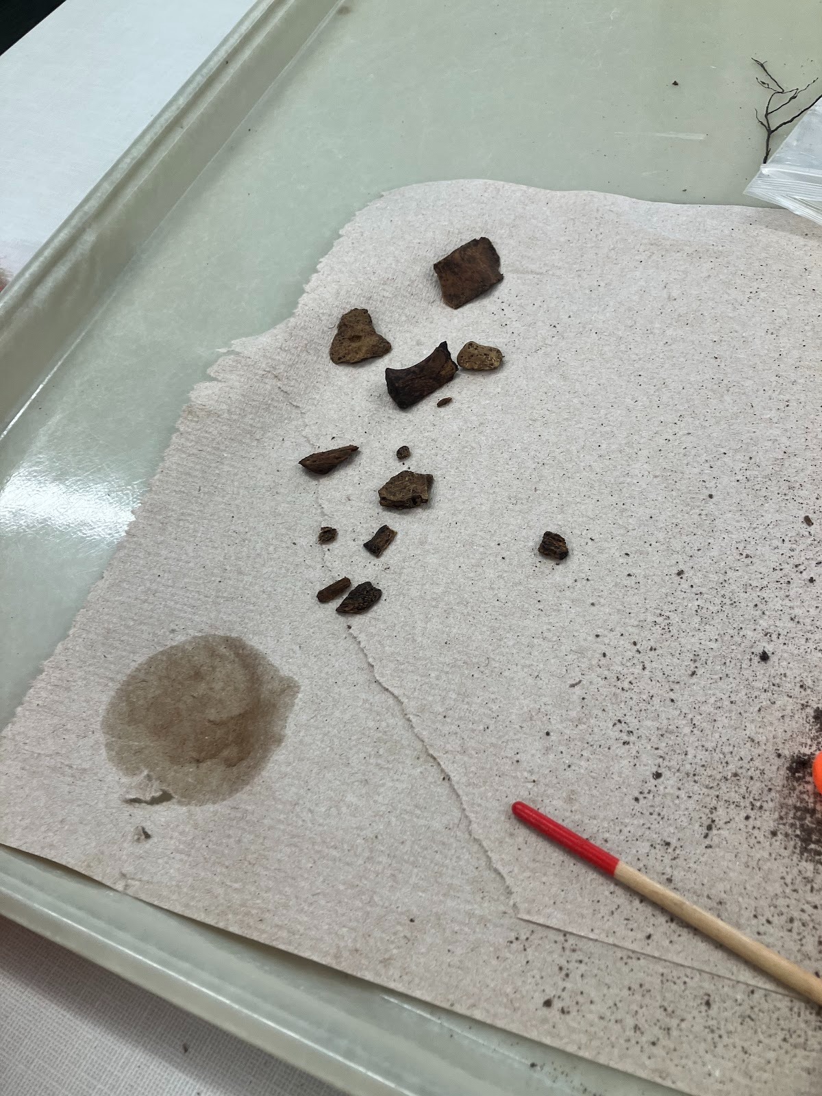 During this process, we also cross-referenced the existing entries in the online database with the original field sheets to verify and correct any inconsistencies in the recorded data. After the artifacts were cleaned, counted, weighed and put into their bag again (or a new bag), they were stored in the archaeology lab behind the classroom, where they were sorted based on where they were found (both based on test pit and excavation unit.) While there were some difficulties in recording this much data from so many different archaeologists, and a few bags were mislabeled, the dataset is mostly ready for some artifact analysis, which we will begin next lab.