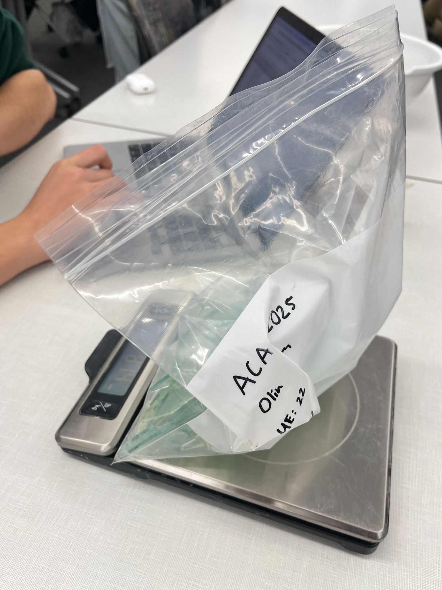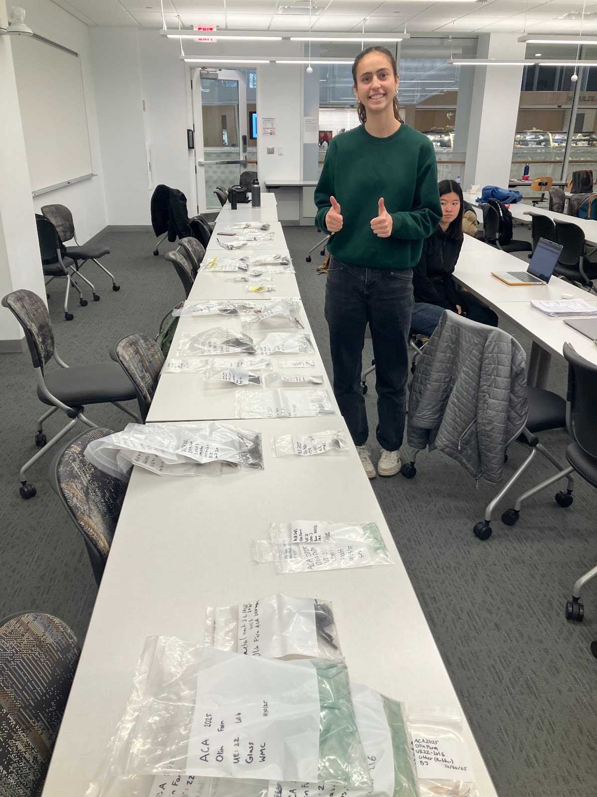 In our case, while in the arb, we labelled each bag with the name of our class (ACA 2025), the location (Olin Farm), the material, the initials of the person who verified the bag and the date of excavation. For the bags that contained artifacts found in shovel test pits, the shovel test pit number (e.g “STP 15” or “STU 4”) was included, while bags that contained artifacts that were found in in excavation units contained the unit number and the layer (e.g “unit 22 layer 4” or “unit 20 layer 1”) so that we can compare artifacts across layers over time. If the bag did not record any of this information, we could not process the artifacts inside (see figure 1 for a picture of one of these bags.) However, this information allows us to use relative dating and context to better understand the placement and relationship of our artifacts to the Olin farm.