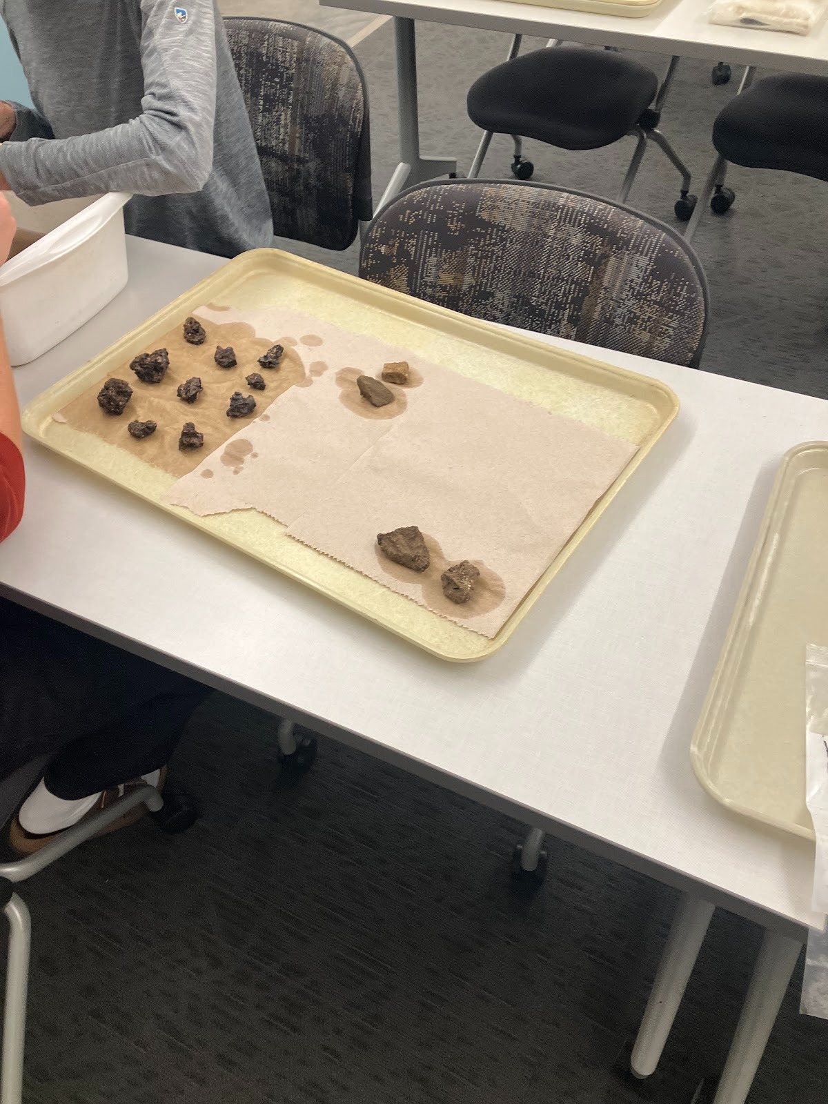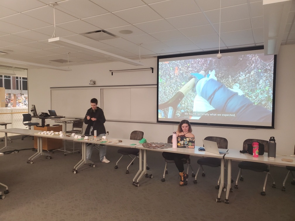 For Community Archaeology Day, the Anderson classroom was used to display the range of equipment used out in the field, along with a video documenting our experiences and interactions with archaeology, which can be helpful for individuals who are not too familiar with the topic. It was also used to display additional artifacts that people were welcomed and encouraged to view, along with some light refreshments for our guests. Out in the Anderson atrium, various groups displayed posters and artifacts that related to their individual research topics, which they shared with individuals coming to experience Community Archaeology Day.
