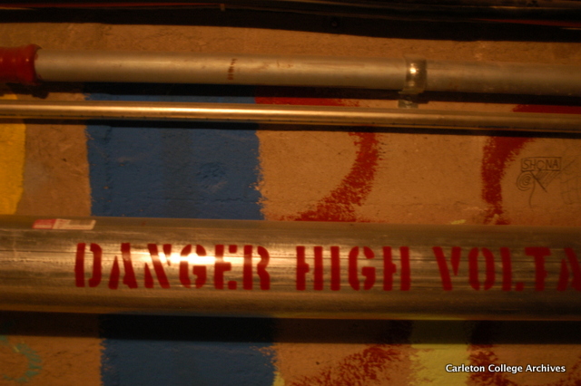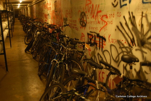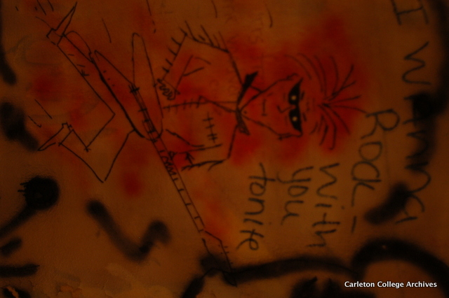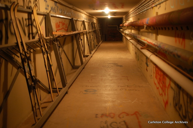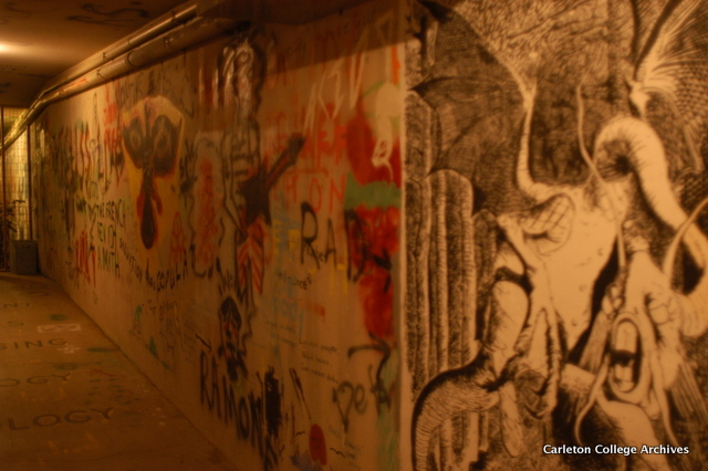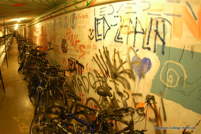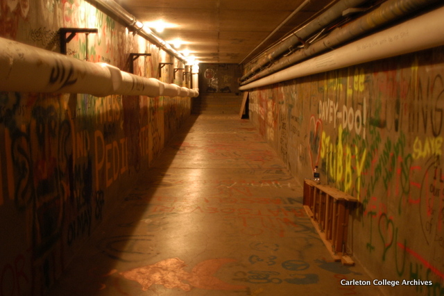 The Carleton tunnels have achieved almost a mythic status on campus having previously been an important part of campus before it was closed indefinitely. Classmate Hiroko Sunamura originally researched this site, finding that the tunnels were actually two systems with the west side being purely functional and the east side pedestrian. The original tunnels were created to distribute heat to all of the campus buildings through steam pipes, also acting as the way to distribute water and power. By 1933 there was 2,746 feet of piping in the tunnels, which kept expanding as the campus expanded, with each new building adding to the web of tunnels.1 The east side tunnels were larger than the west side, with pedestrian use as well as functional use. The first tunnel went from Gridley Hall to Nourse Hall, later connecting to Evans Hall and Cowling Gymnasium, the women’s dorms and the women’s gymnasium. In the Carletonian in 1969 there was discussion of the restriction of access to the tunnels to only women. Men were only allowed in the tunnels between midnight and 2 am Friday and Saturday nights as the only other way to leave east campus was through Watson Hall at that hour. They also had to be accompanied by a female student. If they were caught without an escort they were subject to a peer court.2 The tunnels also reflected the times. In 1963-65 Carleton converted to emergency fallout shelters that could have housed the entire student body, faculty, staff, and their families. The project was subsidized with government funds from the National Civil Defense Program.3 The tunnels were closed indefinitely in 1988 after several instances of vandalism over the last several years, increasing in frequency. One student, having hit her head on a fixture that was vandalized, had to go to the hospital. The school made several attempts to keep the tunnels open with different anti-vandalism to no avail.4 To make the necessary repairs for safety and liability would have cost the school $278,000, not including the yearly cost of security to insure the safety of students.5 It is highly unlikely that the tunnels will every be reopened. Still, they are reflective of Carleton’s history and expansion, of students who have come and gone and left their mark on the tunnel walls.