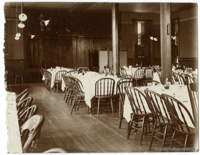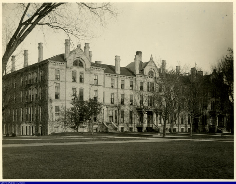 Gridley Hall was first occupied in 1883, with the planning and building stages taking place in 1881 and 1882. Classmate Nicole Connell found that it was one of the first dorms for students on campus. It was built as an all women’s dorm, when the campus had housing separated by gender. In 1886 it was named after Eber Gridley, who gave $40,000 to build the structure, a figure which is over a million dollars today.1 The building, besides holding residential areas, also had a parlor and a chapel, where Dean Margaret Evans held weekly sessions.2 Electric lights were installed in 1908, and in 1912 the dorm went through major renovations. The dining room, kitchen, and maids’ rooms were relocated to the basement to free up area for living quarters, additions of shower baths, and installation of an elevator and water softener. A recreation room was also added at this time, and the building also contained a gymnasium.3 The dining hall was used by most of the women and some of the men in the early years of the college.4 In the 1930’s the dining hall was the site of a weekly all-freshman dinner and meals were served family style. Gridley also housed the Dean of Women, living in a suite in the building known as the Preceptress’ Room. Dean Evans lived here from 1882 to 1908, and the room was later converted to the Office of the Dean of Women. Male students also had restricted access to the building, limited to certain areas of the building and only during certain times of the day. In the 1940’s the parlor was an acceptable coed place and had to be cleared out by 10 pm, with a porch outside serving for “affectionate goodnights.” A student resident worked as a bell girl to alert residents when they had a male visitor and men were not allowed in the rooms.4 After growing concerns about the structural flaws of the building creating a larger risk of a fire or other issues in the near future,5 Carleton decided to demolish the building instead of making costly renovations to the building. It was occupied up the the 1966-1967 school year, and was demolished during that summer. The new Drama and Arts Center, now known as the Concert Hall, was planned to be built on top of the Gridley site, and a new dorm, the Isabella Watson Hall, was built to relocate the displaced students.6 Studying this site would give insights into the early life of the college, as well as perhaps dining practices in the college and insights into the life of female students.