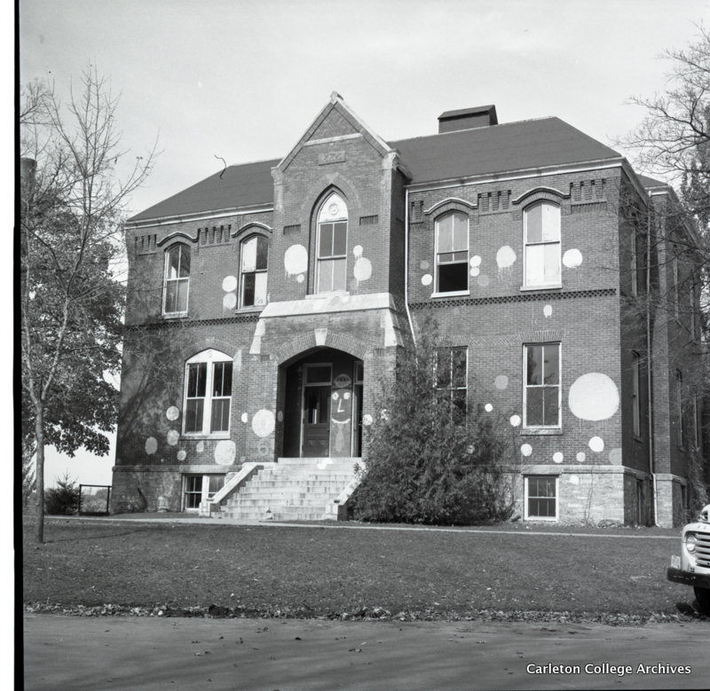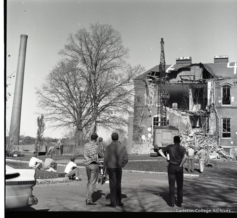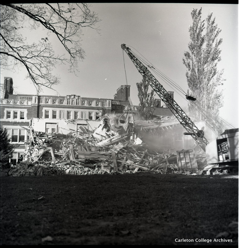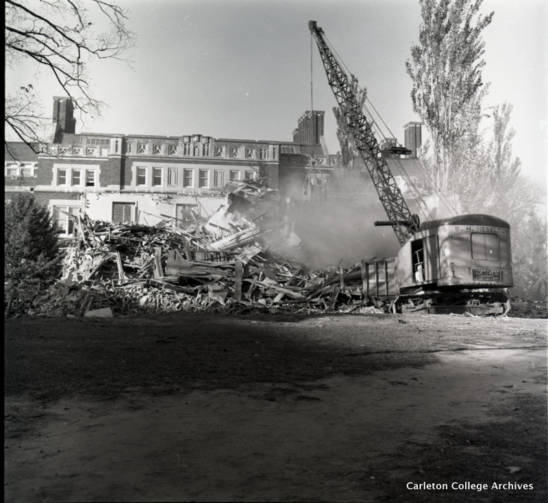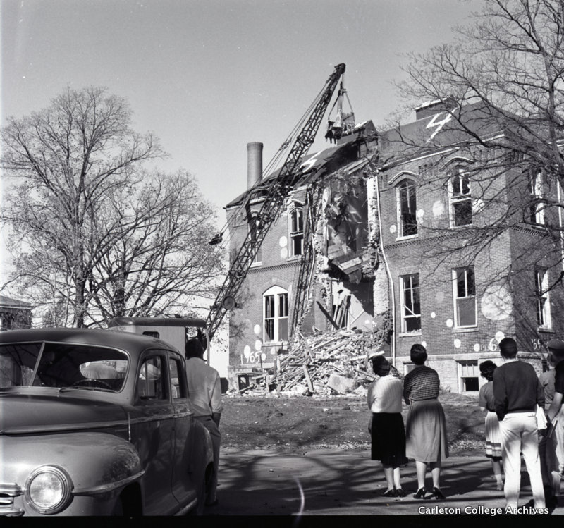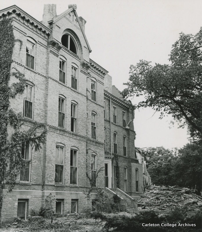 Williams Hall was one of the first buildings on the Carleton campus. According to classmate’s Zayn Saifullah, Williams Hall was designed and built in 1880-1881. Originally referred to as the “Science Hall” it was later renamed Williams Hall after a donation from Dr. Edwin H. Williams of $12,000 to name the hall as a memorial to his late son William Williams.1 Building was prompted in part by the burning of Willis Hall in 1879, providing more space and more security in case of another fire.2 The building served many different academic functions, containing lecture halls, a science library, laboratories, study spaces, and a small museum.3 Over the years it hosted various science departments as well as the art department, hosting chemistry until it moved to Leighton Hall and art moved to the newly built Boliou in 1949.4 Student organizations were also housed within Williams, including the student radio station KARL, the yearbook Algol, and the Carletonian .5 In the mid-1950s, students and faculty thought that Williams was ugly and no longer suitable for use.6 The College officially decided to tear down Williams Hall in 1958,7 and finally demolished the building in October 1961.8 Studying Williams Hall would give insights into the early years of the college given its importance in Carleton’s early development.