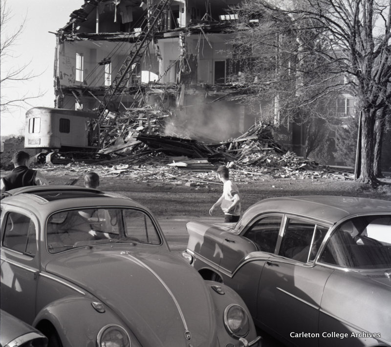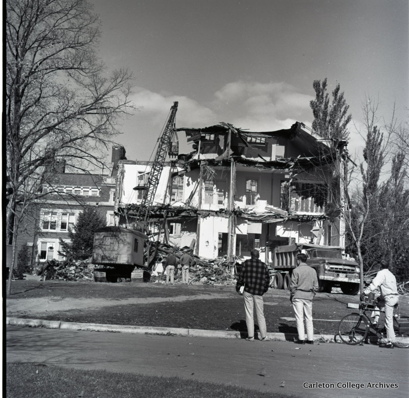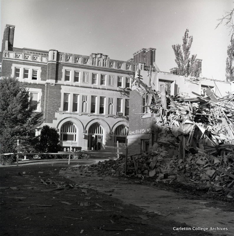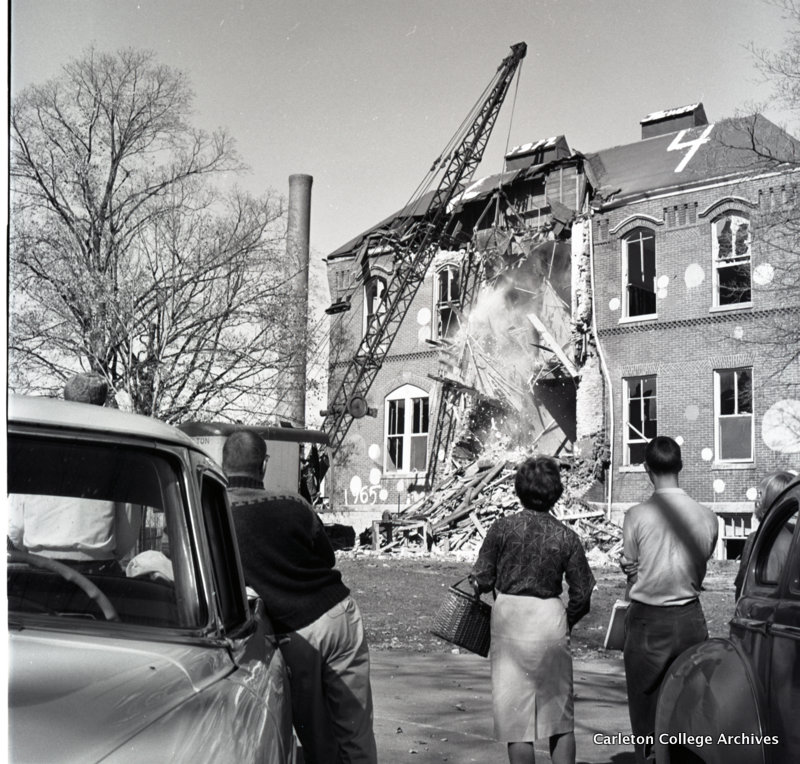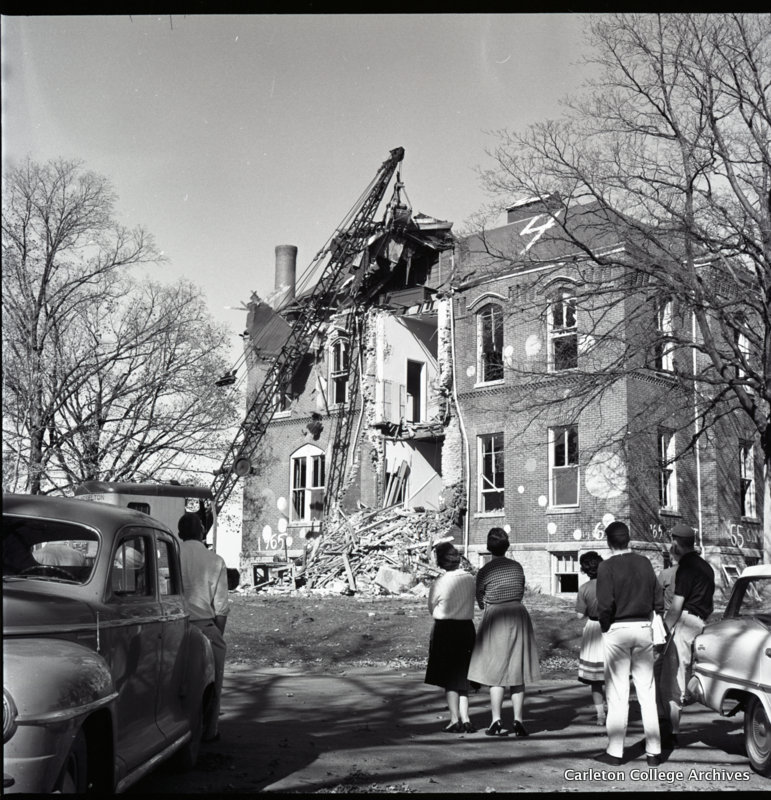 Williams Hall was one of the first buildings on the Carleton campus. According to classmate’s Zayn Saifullah, Williams Hall was designed and built in 1880-1881. Originally referred to as the “Science Hall” it was later renamed Williams Hall after a donation from Dr. Edwin H. Williams of $12,000 to name the hall as a memorial to his late son William Williams.1 Building was prompted in part by the burning of Willis Hall in 1879, providing more space and more security in case of another fire.2 The building served many different academic functions, containing lecture halls, a science library, laboratories, study spaces, and a small museum.3 Over the years it hosted various science departments as well as the art department, hosting chemistry until it moved to Leighton Hall and art moved to the newly built Boliou in 1949.4 Student organizations were also housed within Williams, including the student radio station KARL, the yearbook Algol, and the Carletonian .5 In the mid-1950s, students and faculty thought that Williams was ugly and no longer suitable for use.6 The College officially decided to tear down Williams Hall in 1958,7 and finally demolished the building in October 1961.8 Studying Williams Hall would give insights into the early years of the college given its importance in Carleton’s early development.