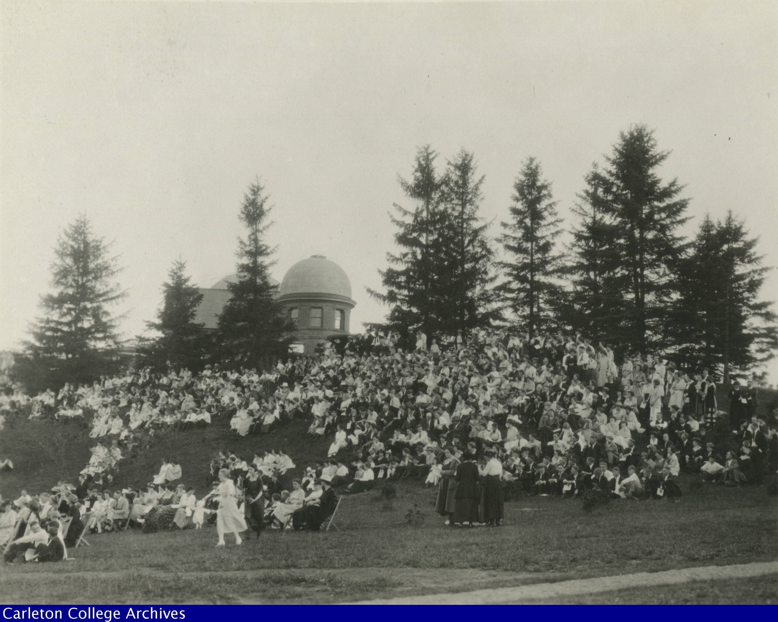 Considered to be one of Carleton’s quirky social traditions, Mai Fete first took place before it had a namesake island in Lyman Lakes. According to classmate Eric Biddulph-West, the College created Mai Fete Island, in addition to its neighboring Stewsie Island, in the process of creating Lyman Lakes: by piling dirt from the beds of the lakes between 1916 and 1917.1 The history of the Mai Fete ceremony is central to the history of women’s social life at Carleton. What began as a spring ice cream social on the lawn of women’s dormitory Gridley Hall turned into a May festival in 1909, when female students held a beauty pageant and a Maypole dance as part of a fundraiser for the Y.W.C.A..2 Although it is unclear when the annual Mai Fete event moved from the Gridley lawn to Mai Fete Island, an archived photo of the 1921 Mai Fete shows a large audience sitting on the hill below Goodsell Observatory facing Lyman Lakes, suggesting that the event moved to the island as early as 1921. The fundraising focus of Mai Fete shifted in the 1920s when administrators recognized the need for a women’s gymnasium on campus. For over 25 years thereafter, Carleton women used Mai Fete to raise money for the proposed gymnasium, which finally came to fruition in 1965 as the Cowling Gymnasium.3 After years of erosion greatly reduced the depth of Lyman Lakes, the College’s Grounds Department restored the shoreline of Mai Fete Island in 2009. Mai Fete Island is a living example of how Carls have interacted with their environment for over a century on this campus.