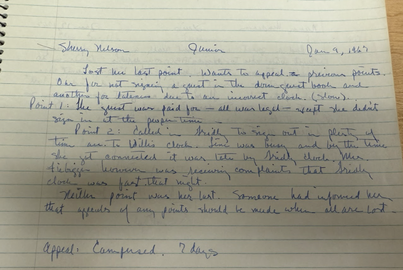 One example of the Women’s Court’s role in a campusing dispute is the case of Sherry Nelson in 1968. These Women’s League minutes, transcribed below, give details about her appeal hearing.