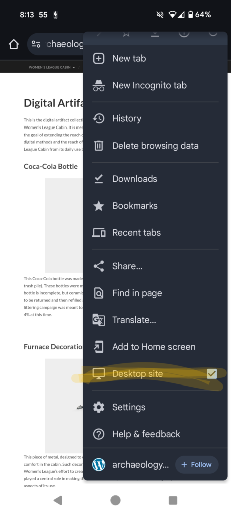 If you are on a mobile device, the 3D scans on each artifact page may not load correctly. For devices running Google Chrome, the current workaround is to view the site in desktop mode. To do this, go to your settings (the three dots in the top right corner) and down in the list is a checkbox that says “desktop site”. Enable it and wait a few seconds, the models take longer to load in on mobile.