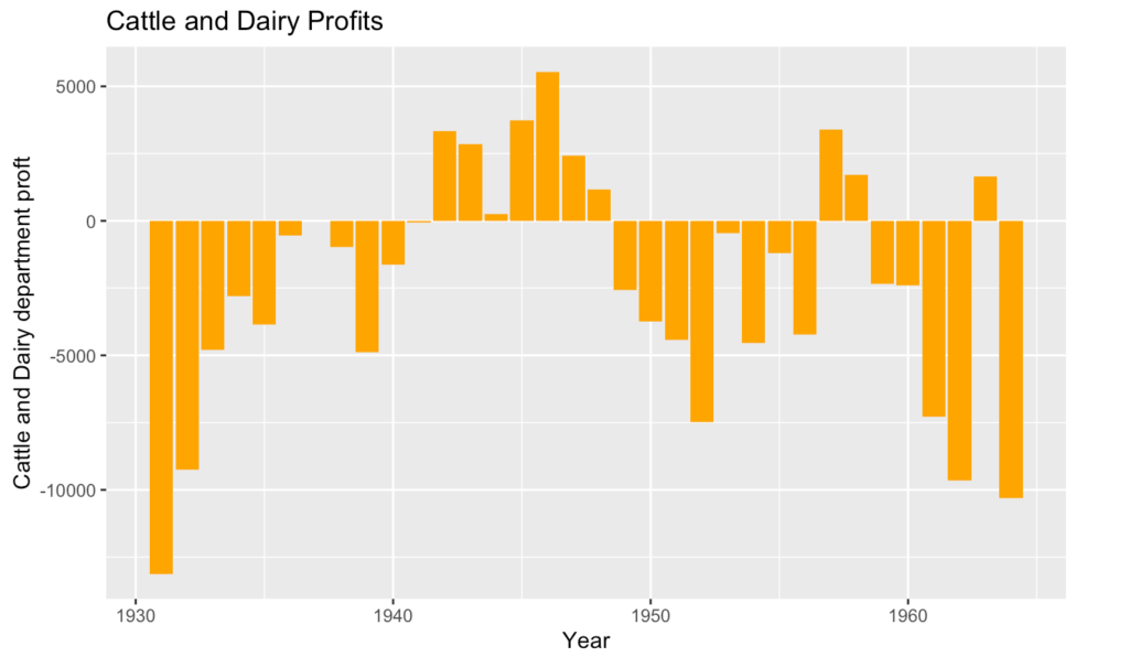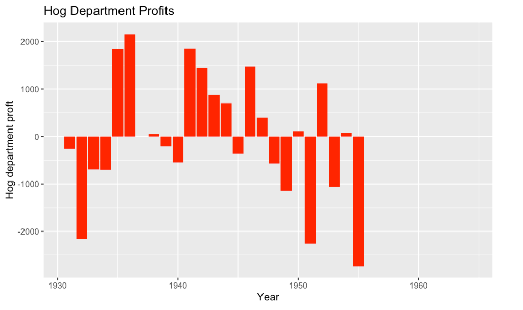 The hog department was one of the most expensive, and least profitable portions of the Carleton farm. Despite it making a lot of money, it also lost a lot of money as well. In fact, the hog department ended in the mid 1950s, well before the Carleton farm closed down. The following is the profit of the farm from the 1930s to the mid 1950s.
