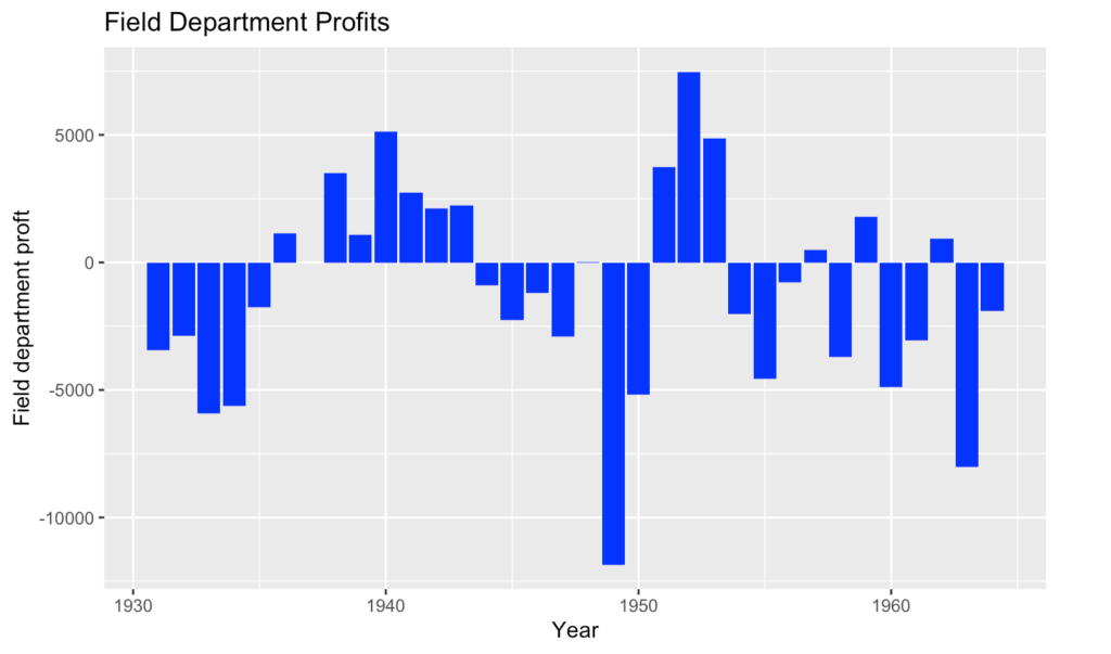 In an attempt to try and understand the overall loss of the farm, we were focused on trying to understand which departments of the farm were contributing to this loss of profit. To do this, we looked through financial reports that essentially broke up each department of the farm into little sections. The most profitable section of the Carleton farm was the field department, or in layman’s terms, the department that grew crops. Below is a graph dictating the profits of the field department: