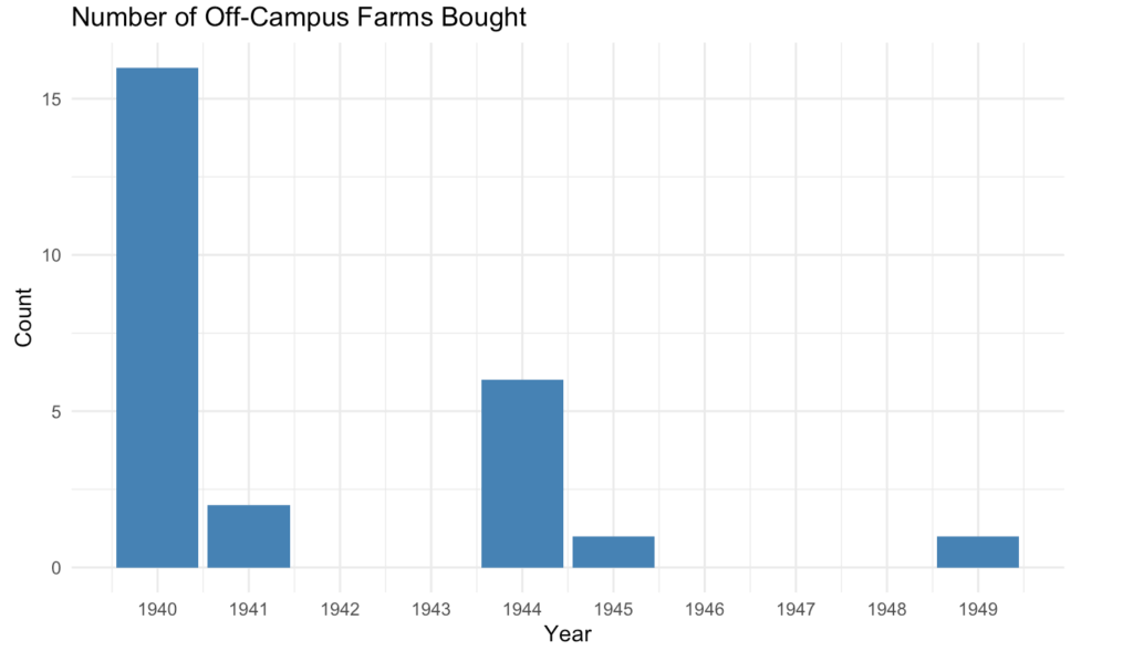 The following graph depicts the number of off-campus farms bought over time. The majority of these off campus farms were bought prior to the 1940s, though more farms were purchased during World War II. This is an important detail as it speaks to the historical standpoint within the United States. During World War II, the United States government needed food to help their soldiers abroad. In order to achieve this high demand for food, they decided to subsidize farmers, essentially purchasing all of their surplus to send overseas. This detail is especially relevant to this project because it shows how Carleton was able to buy so many farms and why they were so profitable during wartime.