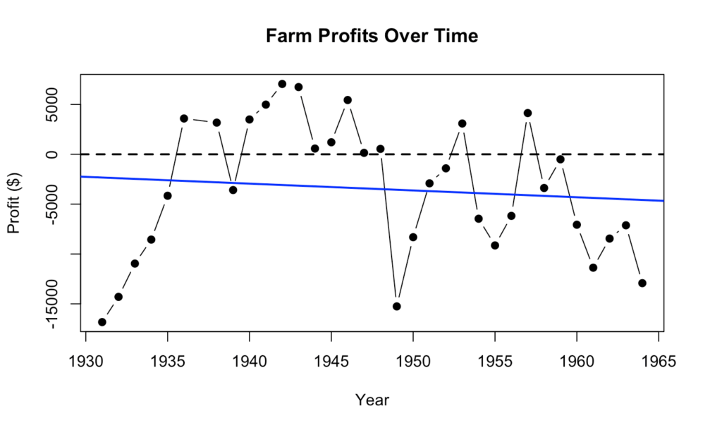 The following graph is a simple representation of the Carleton Farm from the 1930s to the early 1960s, highlighting the profits for each year: