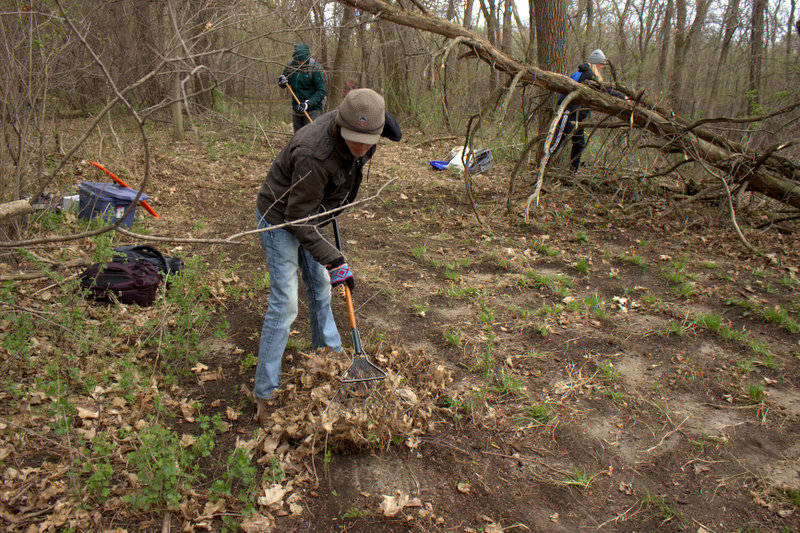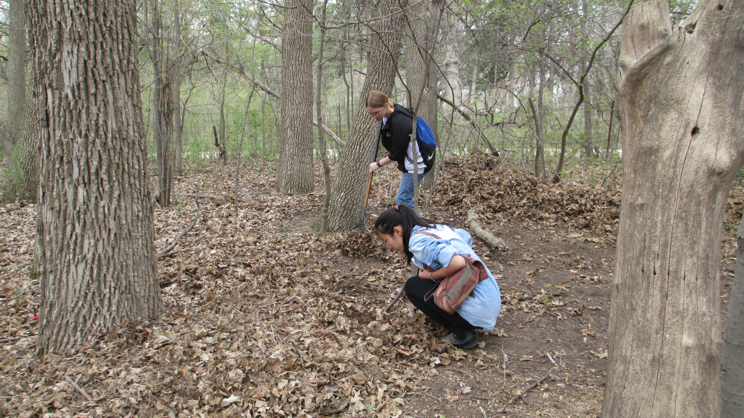 Once the survey grid was mapped out, survey collection began. Many of the survey units had heavy lef litter which was carefully raked away to expose the soil. While doing this, students were careful to look out for any potential artifacts. Because survey units at the WLC site were much smaller than those surveyed in the Field, students preformed ‘complete/gridded’ collections methods. This meant that the class broke up into pair and throughly combed the survey unit.