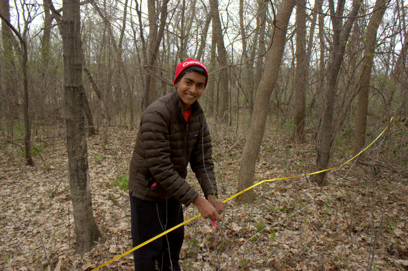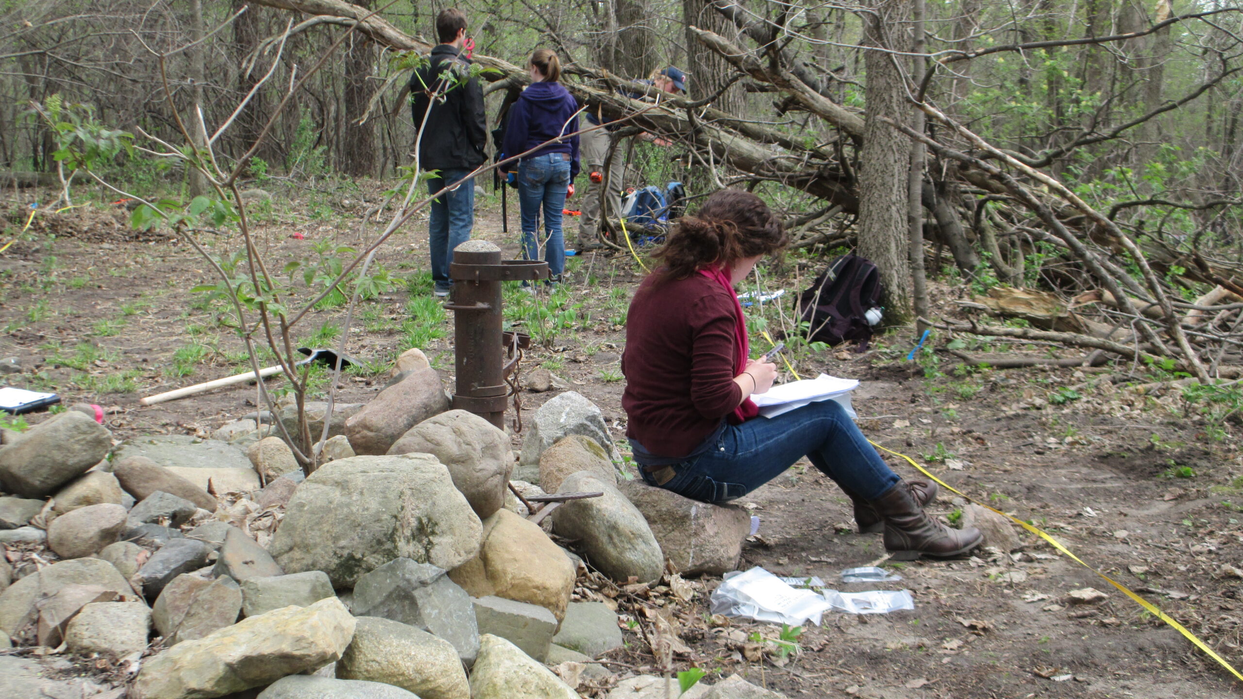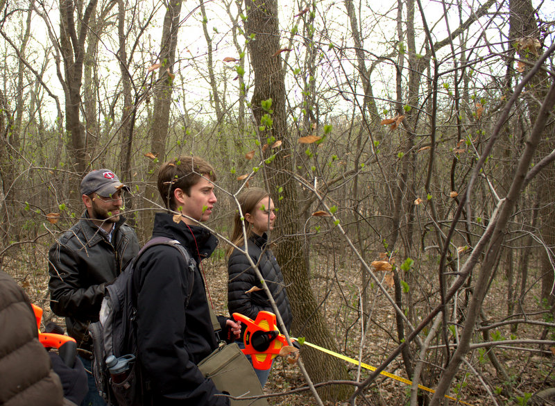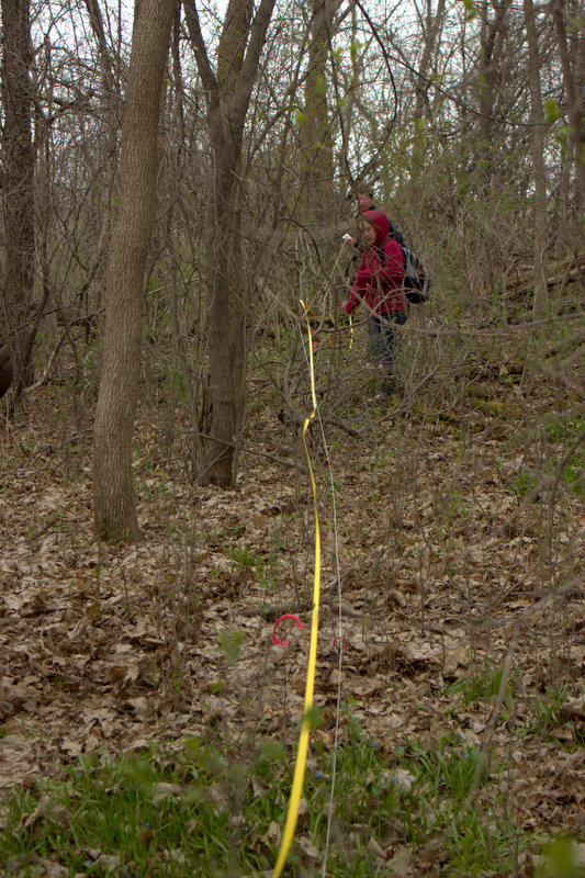 After perfecting pedestrian survey at the Field site, the Archaeology class moved on to the main site: the Women’s League Cabin. Survey of the Women’s League Cabin (WLC) site spanned two lab days, April 21st and 28th, 2015, during which students mapped out and combed twenty 10 by 10 meter survey units. Before surveying began, students learned how to map out survey units using a theodolite (and a theodolite app for iPhones). By using compasses and a theodolite, the class mapped out a theoretically accurate grid with units of roughly the same size.