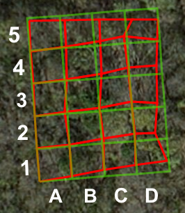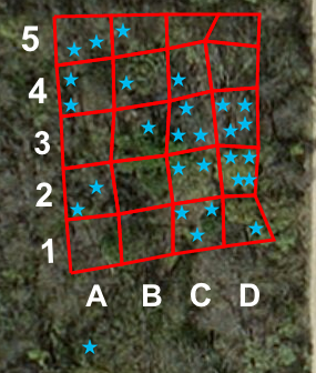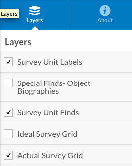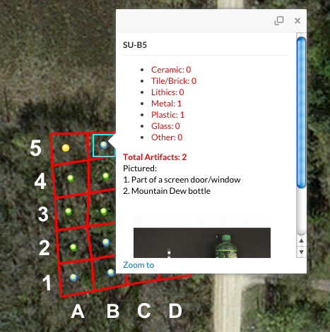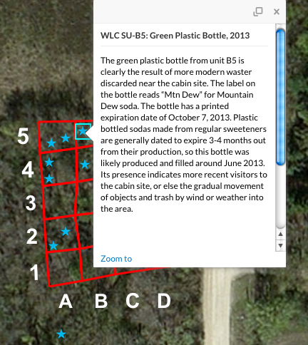 Clicking on these colored dots will produce a ‘pop up’ detailing the materials found within each survey unit. A ‘layer’ option on the left hand side of the application also allows you to turn on and off map layers, exposing other portions of the survey, like object biographies and ideal grid lines. Comparing the survey grid lines is especially interesting, showing how despite best efforts, it’s difficult to create perfectly square survey units and how objects at the site can dictate the feasibility of a survey grid. While laying out the survey grids, the class also kept in mind the location of the historic cabin. Based off of blue prints and the remains of a backdoor patio, the Women’s League Cabin was situated approximately in B-3, though no precise foundations were uncovered. The ArcGIS map includes a layer showing the approximate location of the Women’s League Cabin and patio.