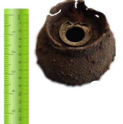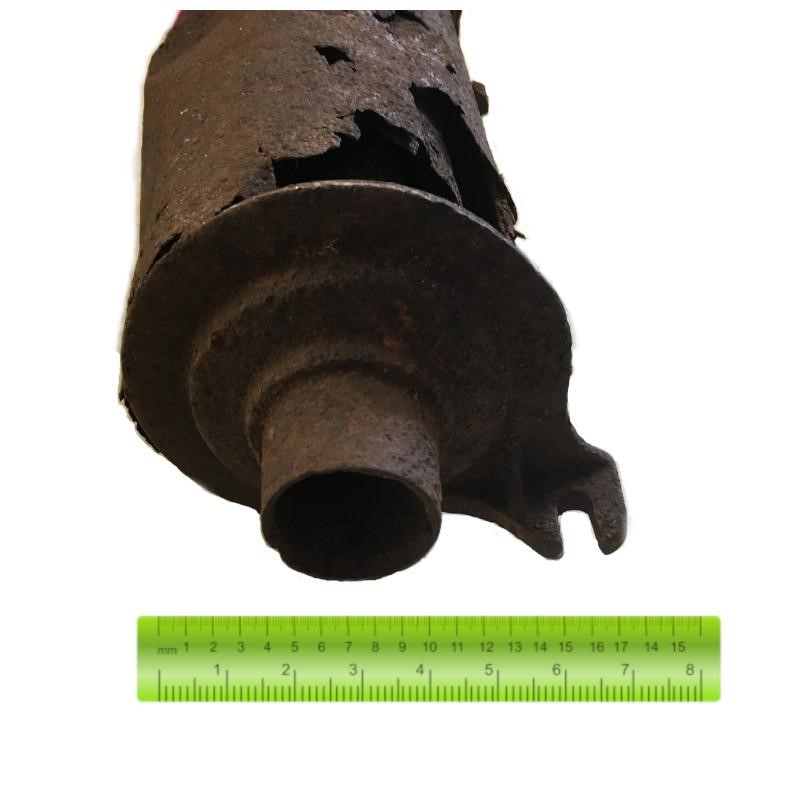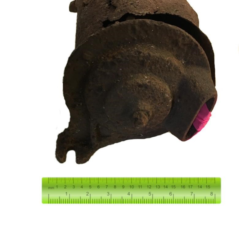 This artifact is made out of metal and is globe-shaped with an opening on top and a rim above. It could be the the bottom part of an old kerosene road flare, which were used to warn drivers about obstacles such as construction. These flares were round, kerosene-burning torches, and often “look like cartoon bombs,” according to the Lovettsville Historical Society (Lovettsville Historical Society & Museum 2018). The flares were manufactured from 1929 until they were succeeded by the pink flaming flares that are now widely used. The presence of this artifact at this site is indicative of past road construction in the area.