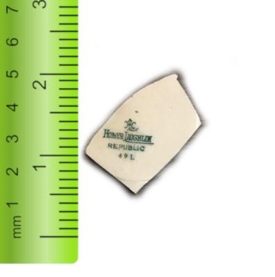 This is a shard of a plate from the Homer Laughlin China Company, a well known china manufacturer. The word “Republic,” which is featured on the shard, refers to a model of dinnerware plates which debuted in 1915 until it was discontinued in the 1960s (Laurel Hollow Park 2017a). A guide to Homer Laughlin backstamps reveals that the “49L” means the plate was made in April 1919, in East Liverpool, Ohio (Laurel Hollow Park 2017b). Homer Laughlin chinaware products were mass-produced and made for the consumption of the American public. One advertisement from 1915 stated self-deprecatingly that the “Republic” lineup of Homer Laughlin chinaware had “been produced in obedience to popular demand. Excepting the hollowware, we do not claim it for any degree of originality” (Laurel Hollow Park 2017a).