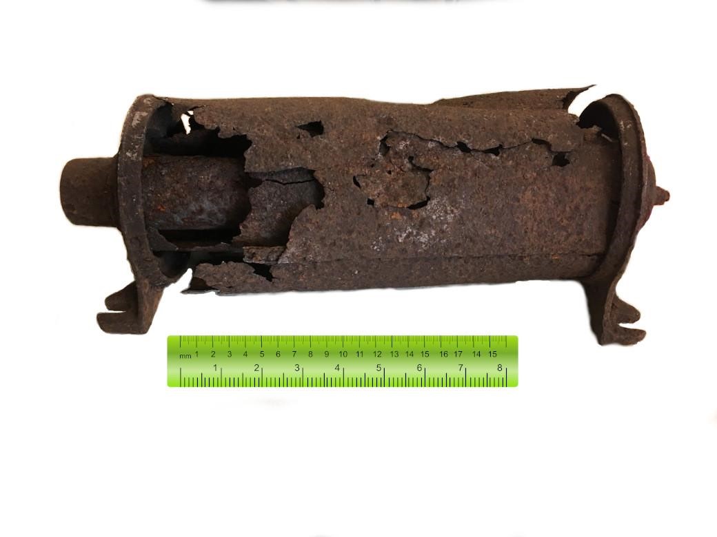 This is a large metal cylindrical object that appears to be completely rusted over. It has an opening on both ends and a tube that goes through the inside. This is an exhaust muffler from a Ford Model T, which was the first commercially available brand of automobile. Exhaust mufflers serve the function of reducing the noise pollution generated by cars. This muffler is likely from the 1910s, since it resembles mufflers that were used in 1917 and 1918 (Model T Ford Club of America 2016).