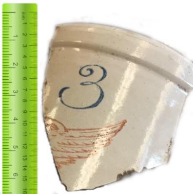 The first artifact is a stoneware shard of pottery with a red wing and the number 3 painted on the front. We identified the painted wing as the logo of Red Wing Union Stoneware Company, a pottery company established in 1877 in Red Wing, Minnesota, which still in business today. After some research, we found that it is a shard of a 3-gallon crock pot that was probably used to hold cured foods. Red Wing pottery products were valued because of their durability: they were regarded as the “Tupperware of their day” (City of Rogers, Arkansas 2003). It was most likely produced during the 1910s, which is when the company started emblazoning its signature, large red wing on its pottery (City of Rogers, Arkansas 2003). The red wing pattern itself was adopted around 1906 and was used by the company until 1967 (Red Wing Collectors Society 2019).