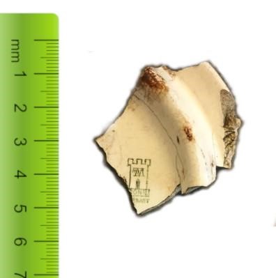 This is a sherd of a stoneware plate, jar, jug or vase with part of the manufacturer logo on it. The logo is most likely for the Royal Bonn Company in the 19th and 20th century, based on a plate with the same mark (In The Vintage Kitchen Shop 2019). According to an antique site, Royal Bonn was the name used by the Franz Anton Mehlem Earthenware Factory, which made pottery from 1836 to 1931 in Bonn, Germany (Internet Antique Gazette 2019). The company’s greatest period of productivity was from 1880 to 1921, during which it was known for making less-expensive replicas of Royal Worcester porcelain ceramics. Since this sherd was produced in Germany, it bears the significance of being an imported object, thereby showing that the Waterford Mill and the surrounding community had contact with international trade.